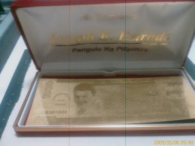 This was issued to honor the 100 year celebration of the Philippine Independence. This is an extremely rare collectible given by Erap to his closest relatives and supporters. It's gold plated and features the face of Erap at the front and the back features just like the reverse of the regular P1000 note. It's gold plated and features the face of Erap at the front with the serial number of the bill as JE6301998. It comes with a special case with the seal of the presidency in front and has "his excellency, Joseph Estrada, Pangulo ng Pilipinas" printed inside.